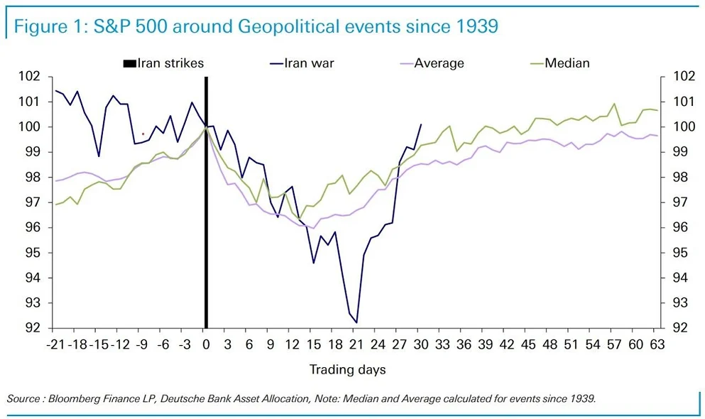 La guerra en Oriente Próximo no supone una excepción en el comportamiento del S&P 500. Según los datos que recoge Deutsche Bank, el índice cae con fuerza en el inicio de cada conflicto geopolítico, para ir recuperándose progresivamente las siguiente semanas.